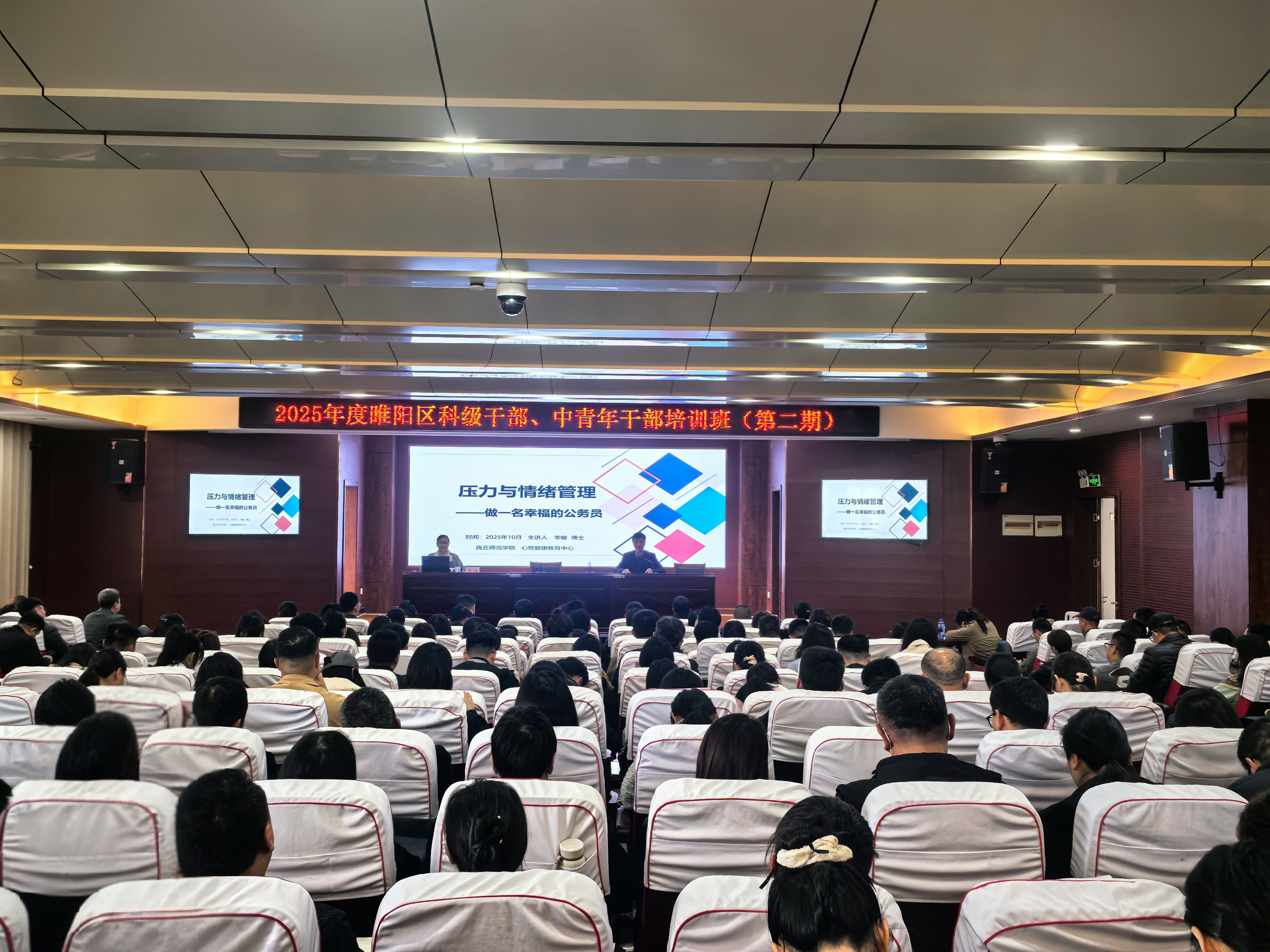 10月23日下午,为深化加强校地合作工作,商丘师范学院心理健康教育中心教研室主任李敏博士应邀赴睢阳区委党校开展心理健康专题培训。睢阳区230名科级干部、中青年干部参加培训。